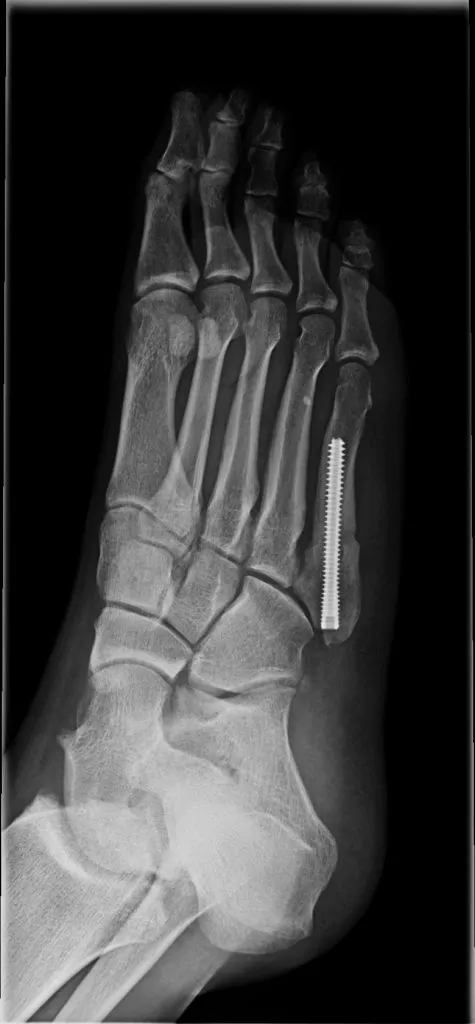 - Conservatief (gips of brace): bij een niet-verplaatste Jones fractuur, of bij patiënten met minder hoge sportieve eisen, kan gekozen worden voor immobilisatie. Je krijgt een gips zodat de voet kan rusten. Belangrijk is dat je ongeveer 6–8 weken niet op de voet mag steunen, zodat het gebroken voetbeentje kan helen. Controlefoto’s worden gemaakt om te zien of de breuk goed aan het herstellen is.